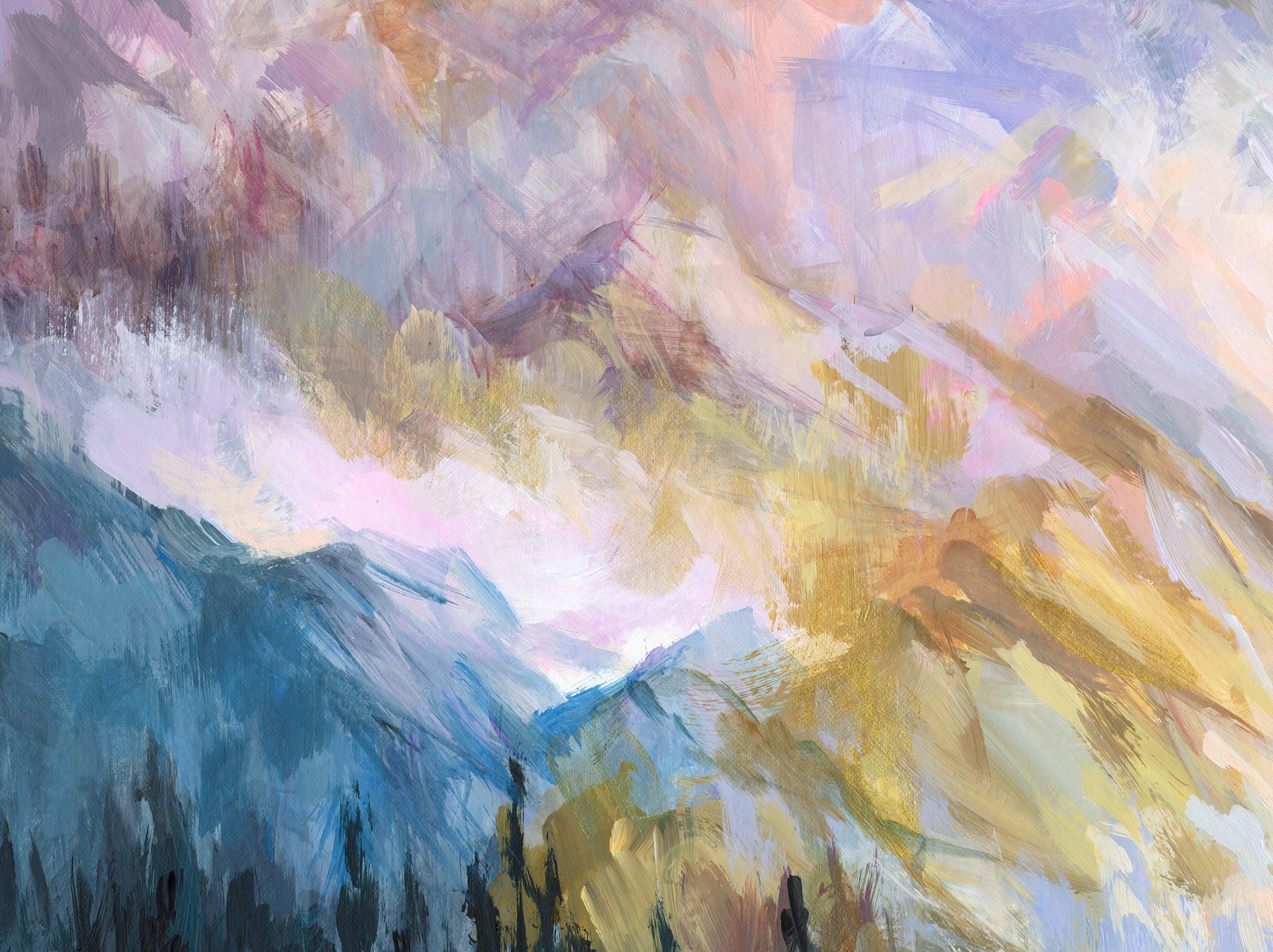 “Colorful Mountain Impressions” by Leon Devenice is an original painting on canvas that captures a luminous mountain landscape layered with light and atmosphere. Soft peaks rise through drifting clouds as cool blues, warm golds, and gentle violets mingle across the scene. The composition conveys calm, openness, and a sense of elevation, inviting the viewer into a serene alpine moment.