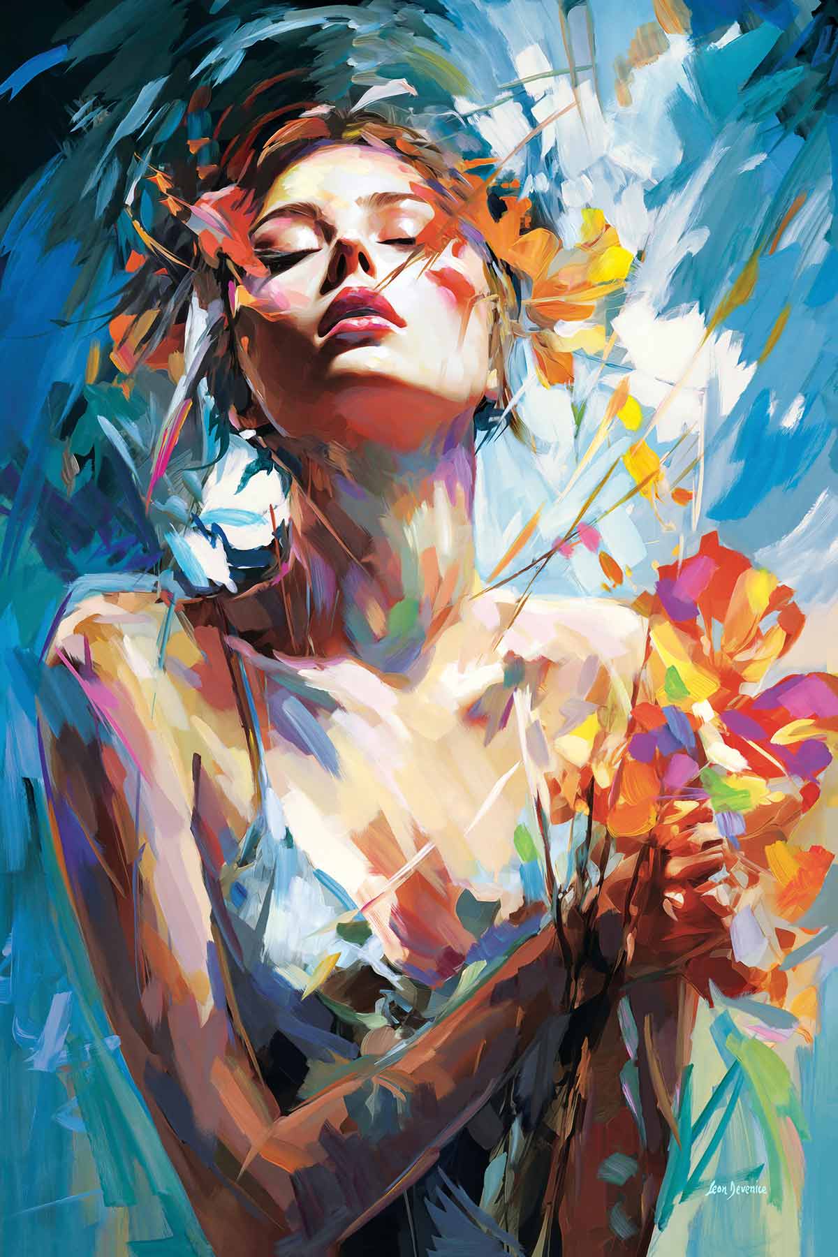 Figurative portrait painting of a woman bathed in light, eyes closed, holding vivid flowers close to her chest—lost in a moment of feeling, by Leon Devenice.