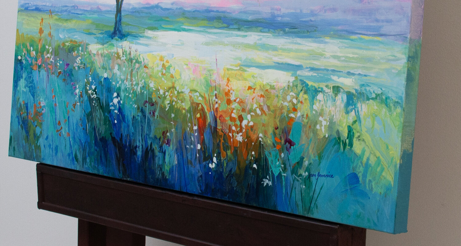 Set beneath a luminous sky of blue and pink, a lone tree stands crowned in fiery tones of orange, fuchsia, and violet. Around it, a sea of wildflowers stretches across the field, where cool greens and blues meet the soft glow of morning. The painting captures a moment of peaceful brilliance—a calm filled with color and breath.