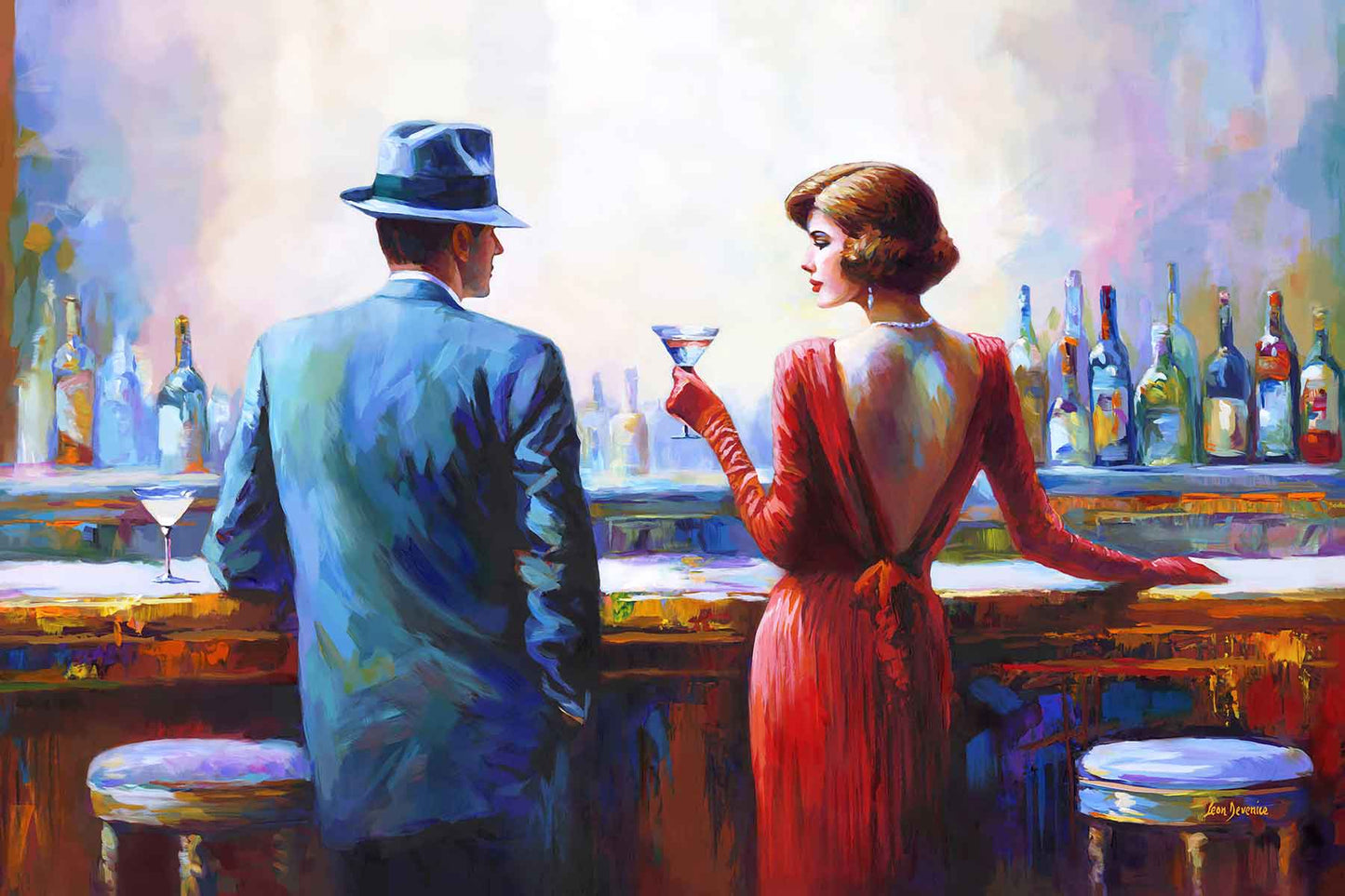 Painting of a man and woman at a bar, locked in silent connection—her red dress glowing, his presence cool and composed, by Leon Devenice.
